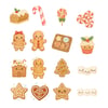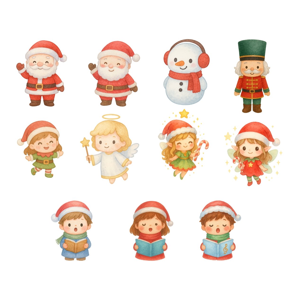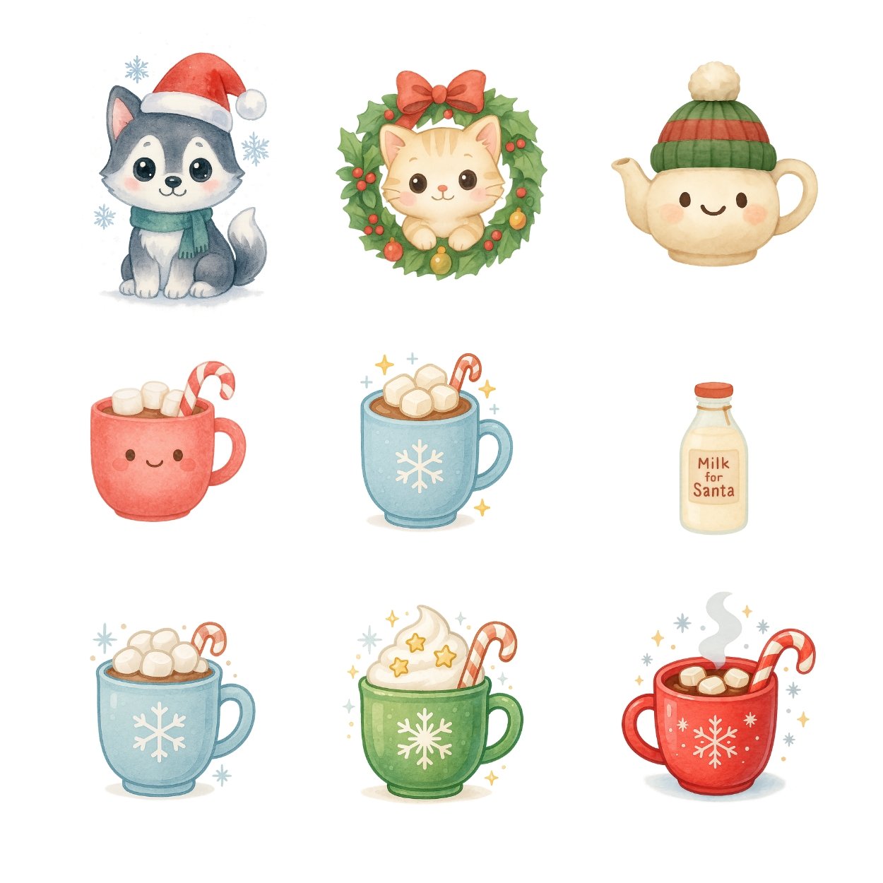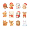 Characters & Animals: Christmas fairy, elf girl & boy, Santa chibi, Mrs. Claus, nutcracker, angel, snowman, reindeer with scarf, fawn, penguin, husky puppy, kitten in wreath, kitten in gift box, puppy with stocking, puppy with scarf, owl, robin, squirrel, hedgehog (with gift), polar bear, arctic fox, bunny, boy & girl carolers.