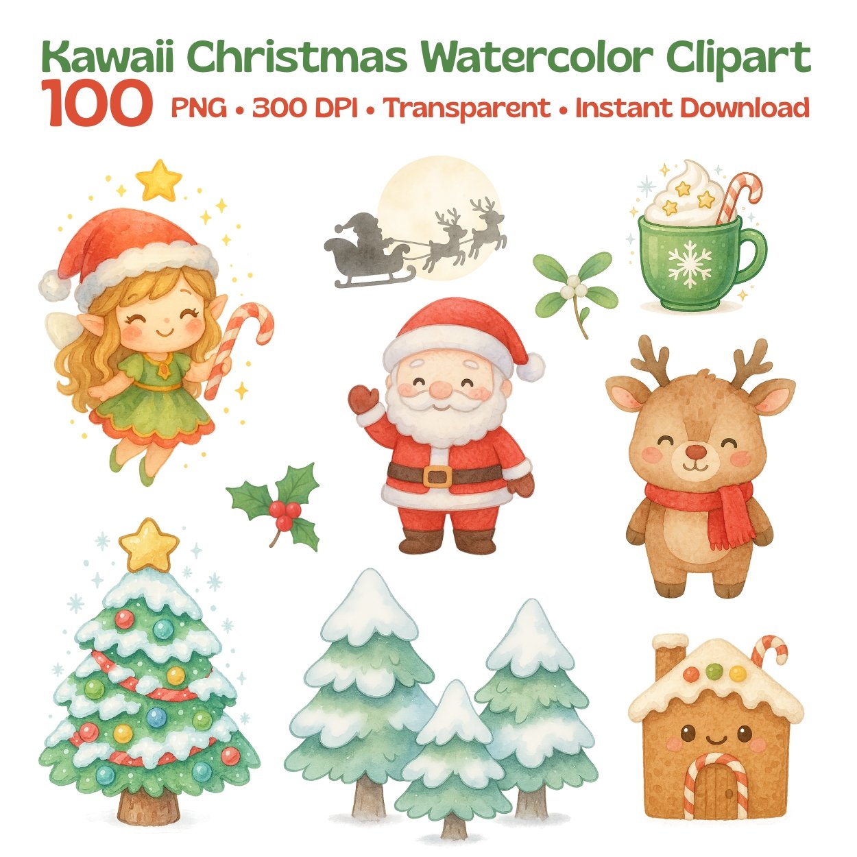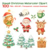 Kawaii Christmas Watercolor Clipart Bundle — 129 PNG — 1024 px — Transparent — Instant Google Drive Download