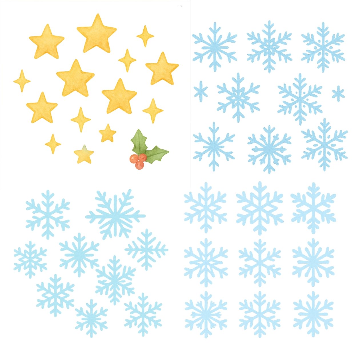 Mini Sets & Botanicals: Scattered stars (mini set), assorted snowflakes (mini sets), mistletoe sprig, holly sprig.