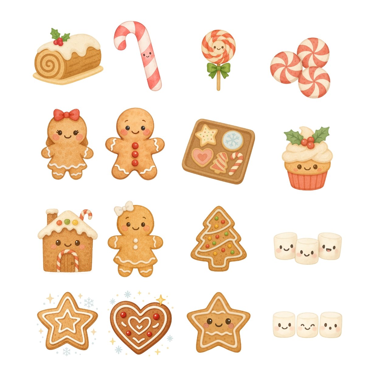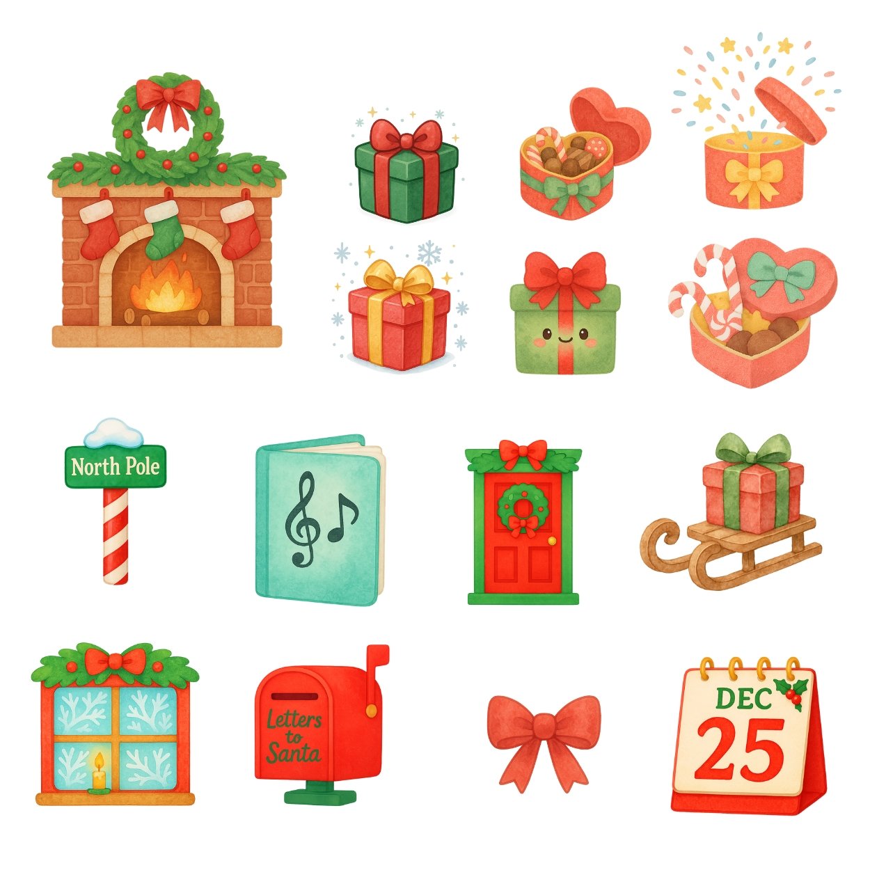 Classic Holiday Props: Gingerbread house & heart cookie, star cookie, Christmas tree with star, wreath (no face), stocking with gifts (kawaii), sled with present, jingle bells, mittens (red & green), hot cocoa mugs blue/green/red (marshmallows, candy cane), candy canes, kawaii star, blue snowflakes, round ornament, topper star, heart made with two candy canes, big ribbon bow, maize-cranberry garland, gift tags (set), curly ribbons (set), plaid stocking, single gift, stacked gifts, open gift with confetti, ice skates (regular + festive), sled (3/4 view), string lights garland, “North Pole” sign, “Dec 25” calendar, snow shovel.