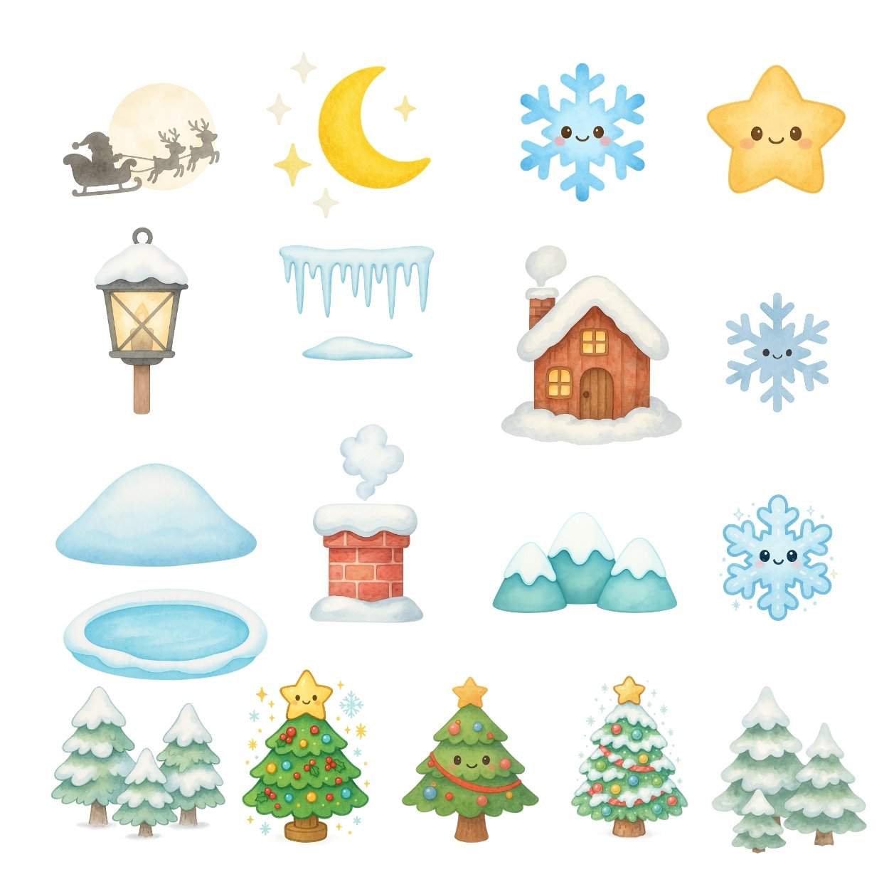 Scenery & Outdoors: Snowy cottage, village row of houses, snowy pines (set), brick chimney with smoke, frosted window, door with wreath, “Letters to Santa” mailbox, snowy hills (set), icicle border, snow mound, frozen pond, aurora, moon & stars, Santa sleigh silhouette with moon, snowy lantern, sled tracks.