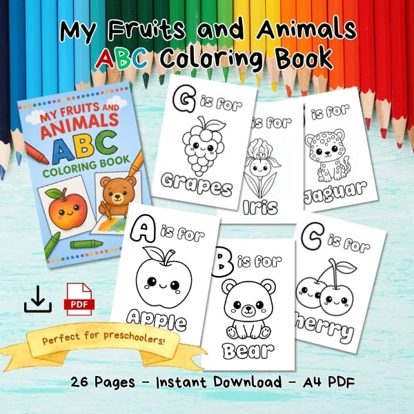 Make learning fun with the Kawaii Alphabet Coloring Book – Fruits Edition! This printable PDF pack features 26 adorable coloring pages, one for each letter (A to Z), each paired with a cute fruit character in kawaii style. Perfect for toddlers, preschoolers, and homeschooling — this resource supports early literacy, motor skill development, and creative play.
