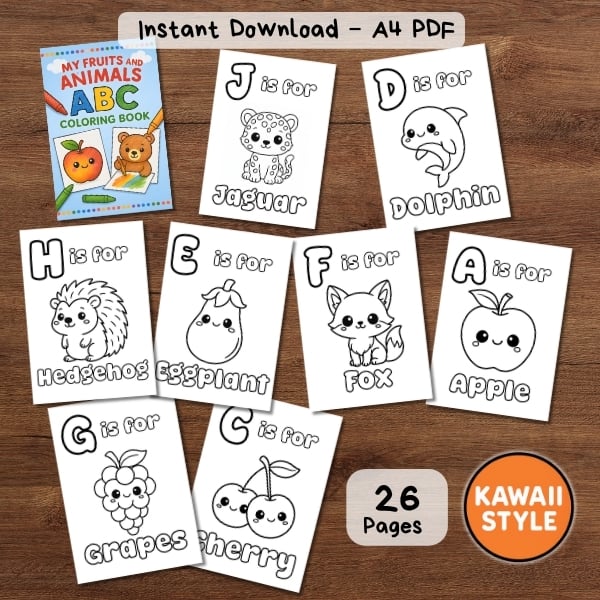 - 26 high-resolution PDF coloring pages (A–Z), each with a kawaii fruit design.