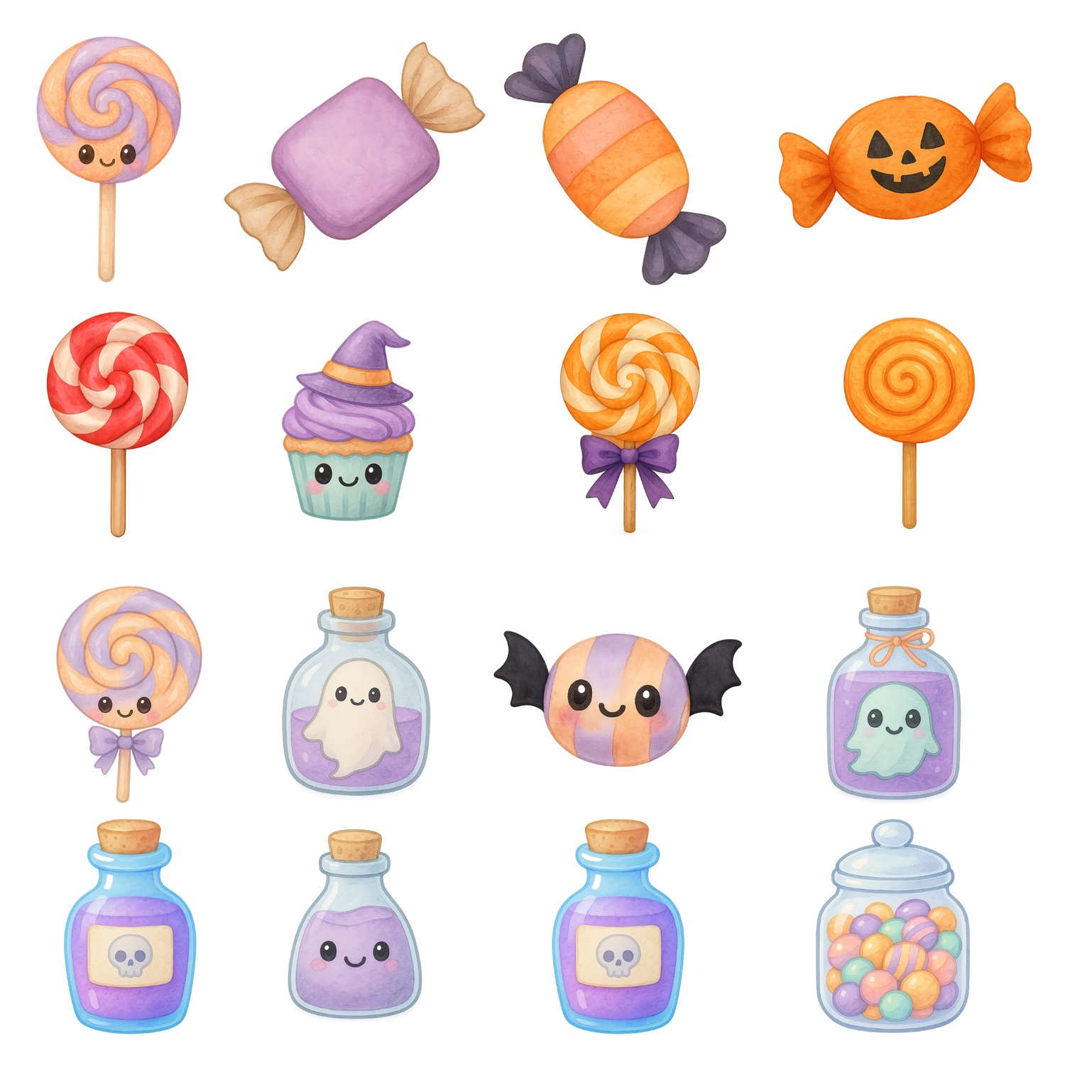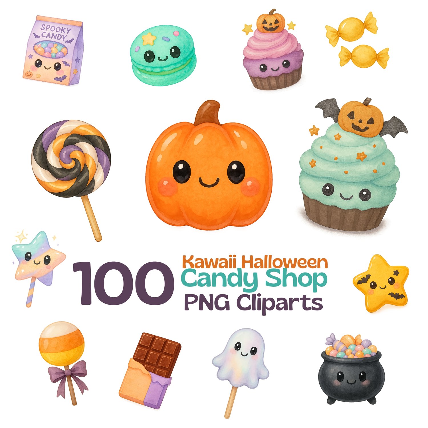 Kawaii Halloween Candy Shop – 100 Watercolor Pastel Cliparts | 300 DPI PNG Bundle