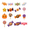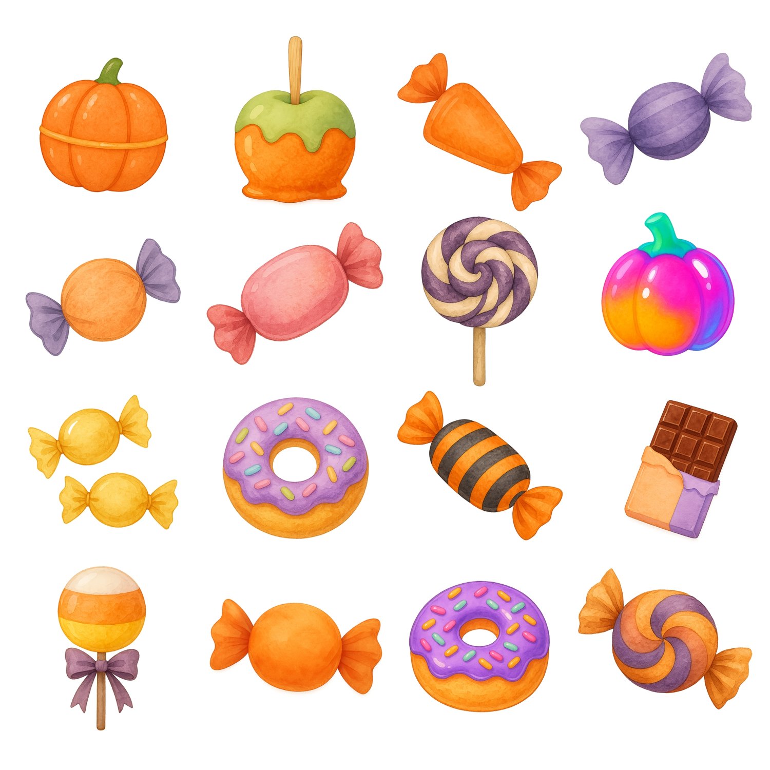 Lollipops, cupcakes, donuts, truffles, chocolates, cookies, pies, candy jars, wrapped sweets, and more.