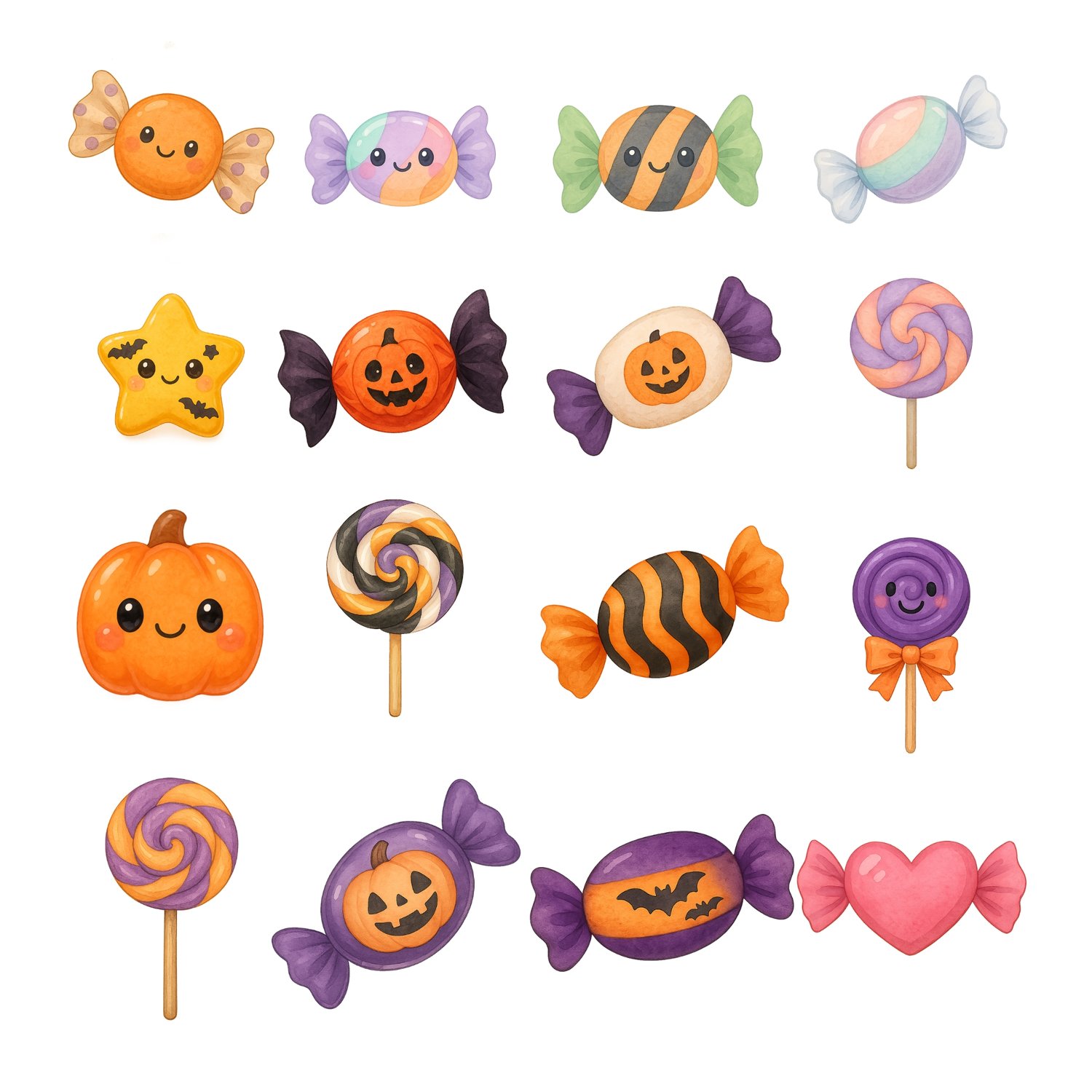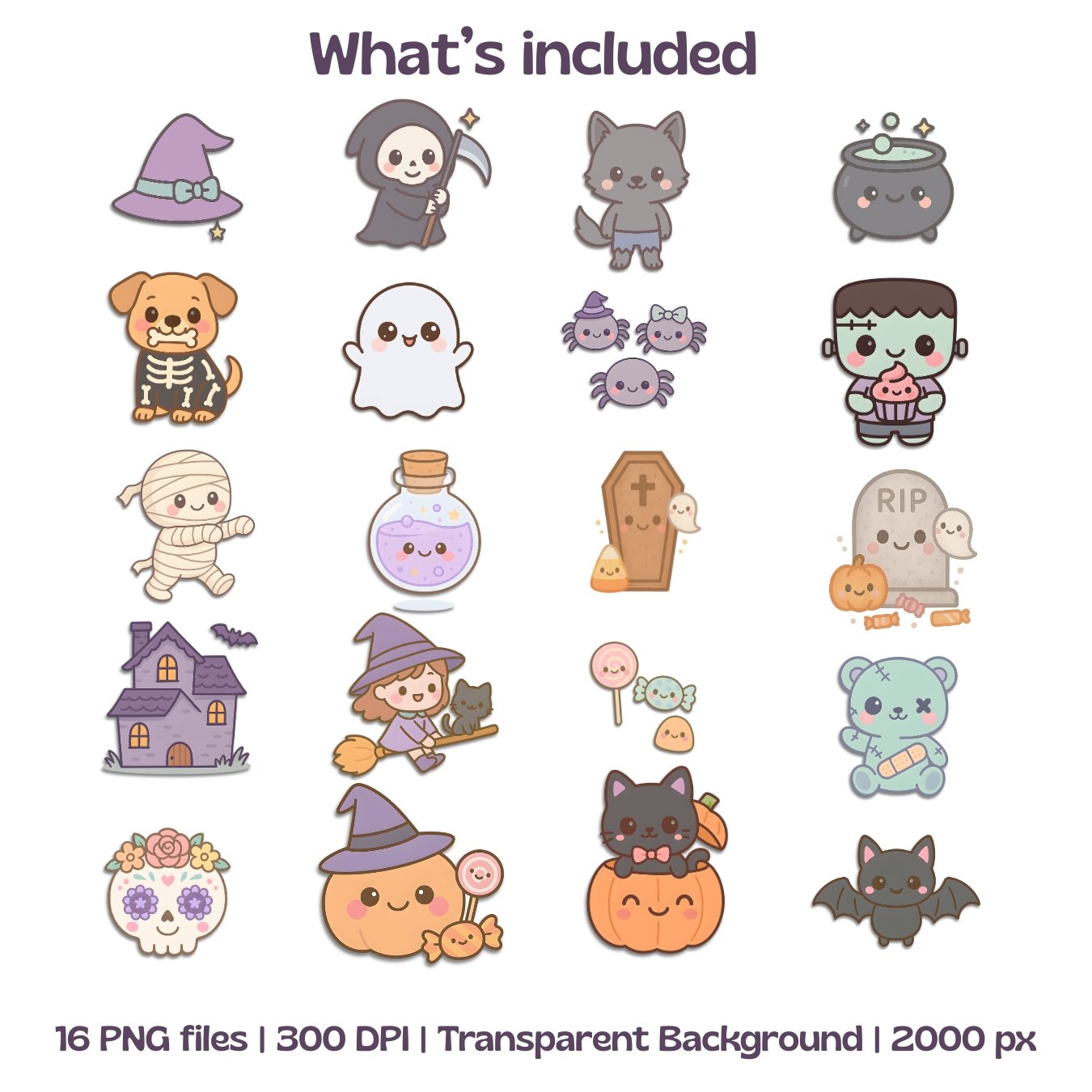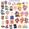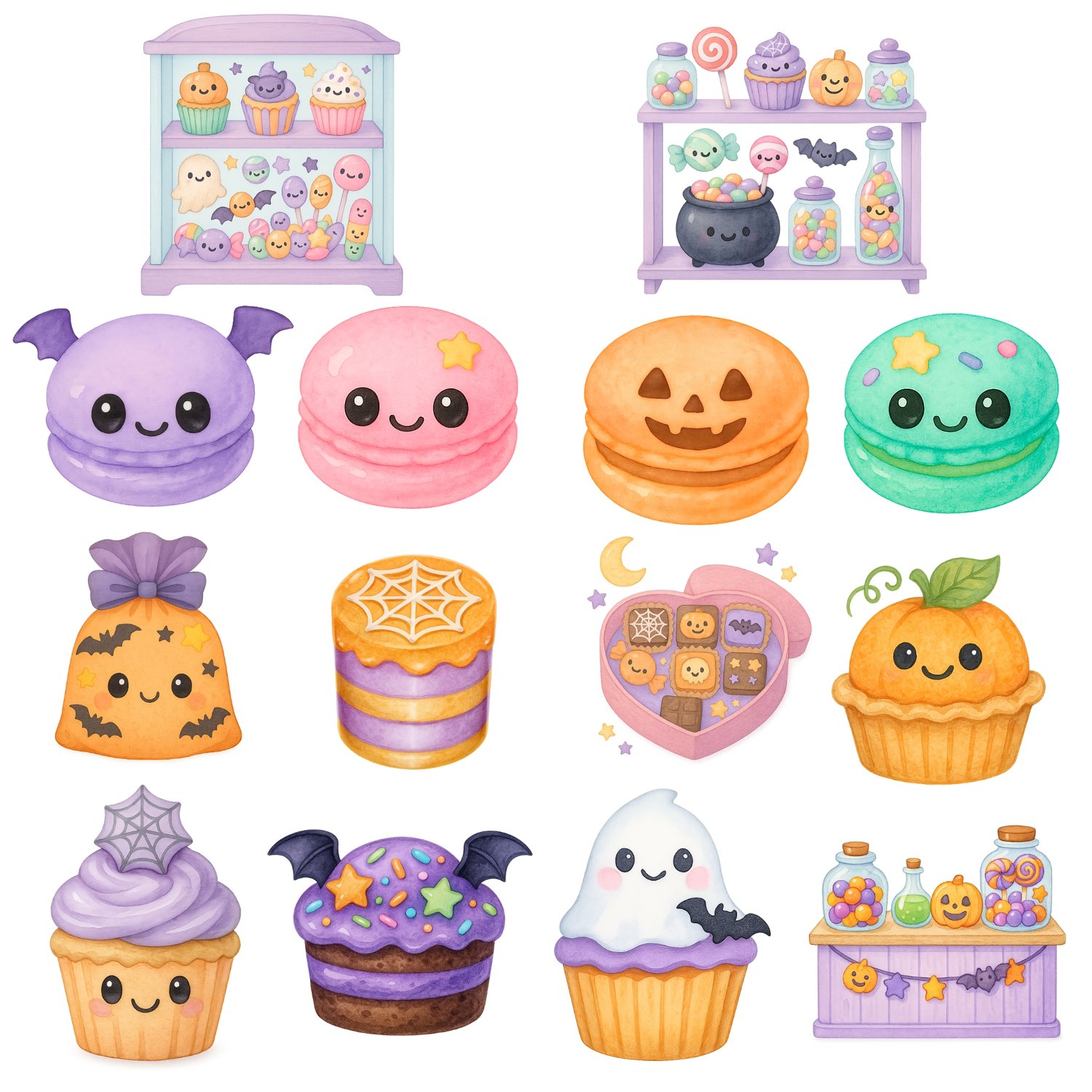 40 pastel kawaii characters — ghosts, cute witches, smiling pumpkins, playful cats, spooky friends.