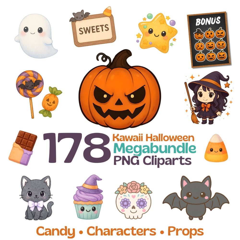 ✨ Add a sweet & spooky vibe to your crafts with this Mega Halloween Kawaii Clipart Bundle — a huge pack of 178 pastel PNGs designed in an adorable chibi style. Perfect for teachers, crafters, small business owners, and digital creators who want everything they need for Halloween in one set!
