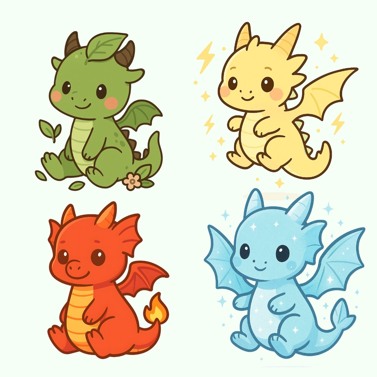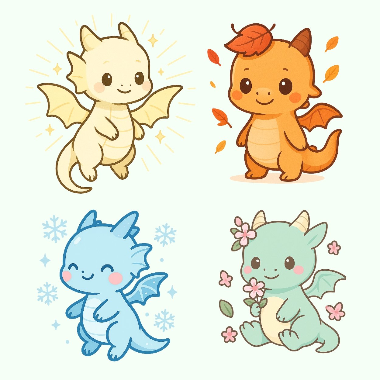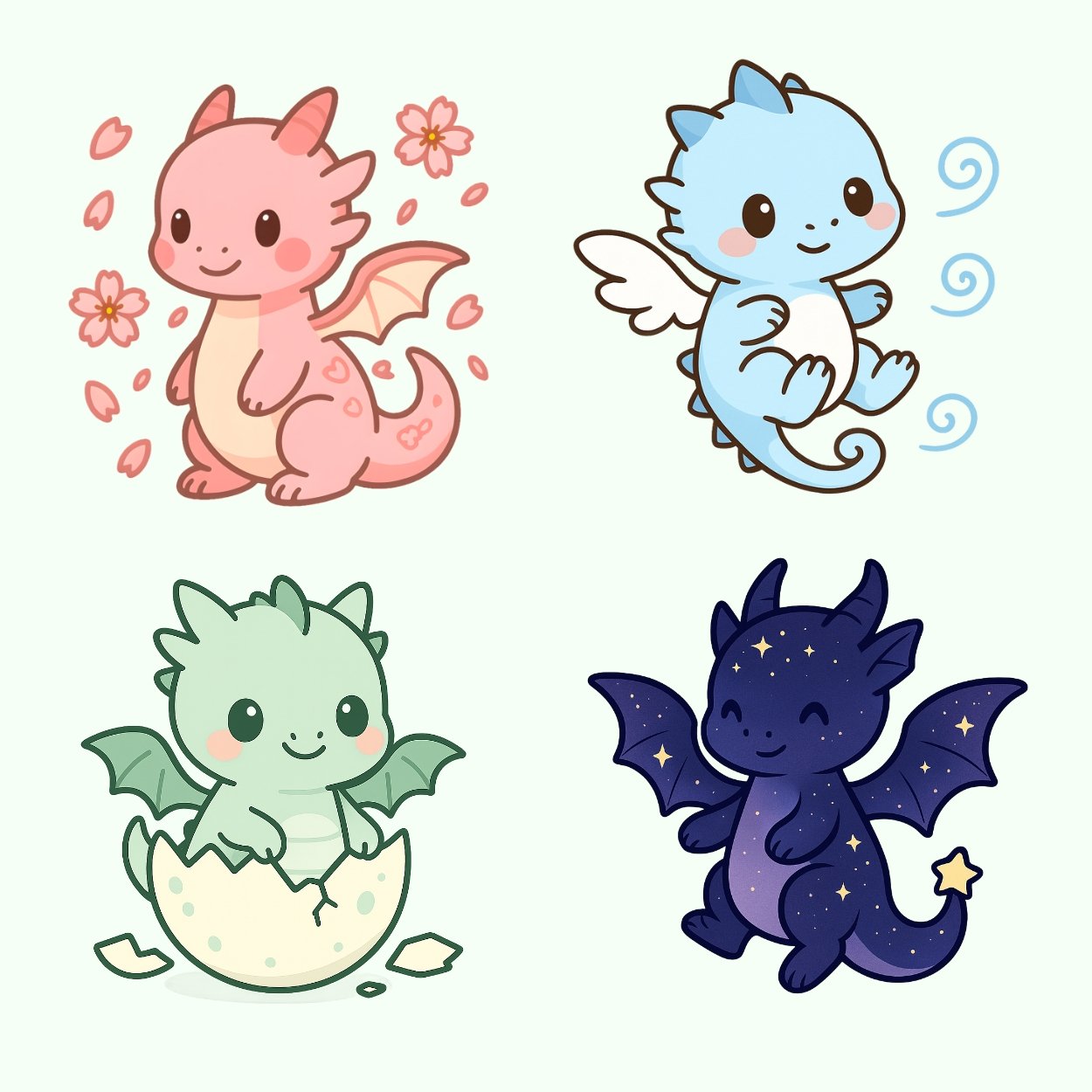 This exclusive digital set includes 17 unique baby dragons โ inspired by nature, fantasy, and the seasons. From fire and ice to cherry blossom and moon dragons, each illustration was designed in a pastel chibi kawaii style consistent with the Happy Pets Shop aesthetic.