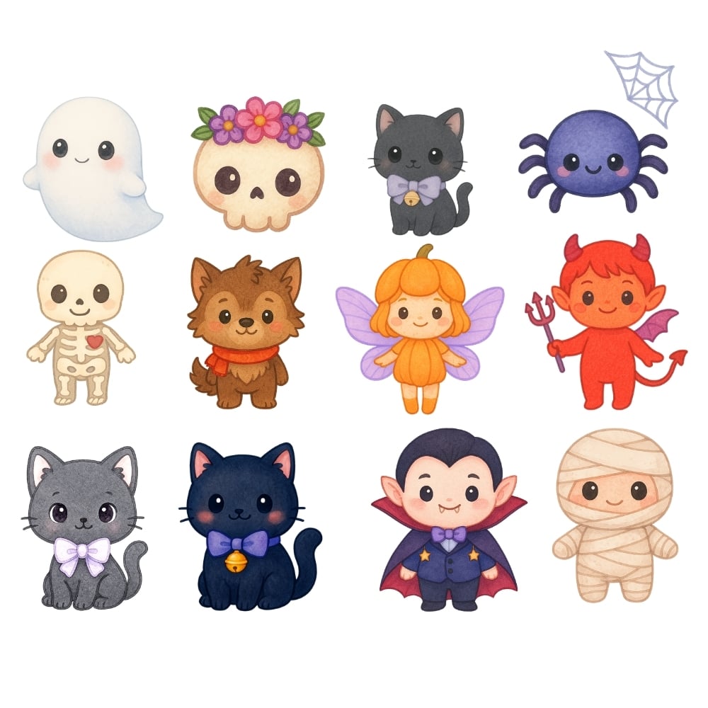This set includes 38 high-resolution illustrations in PNG and JPEG (2000px / 8 inches / 20 cm, 300 DPI, transparent background) — perfect for all your Halloween-themed creative projects.