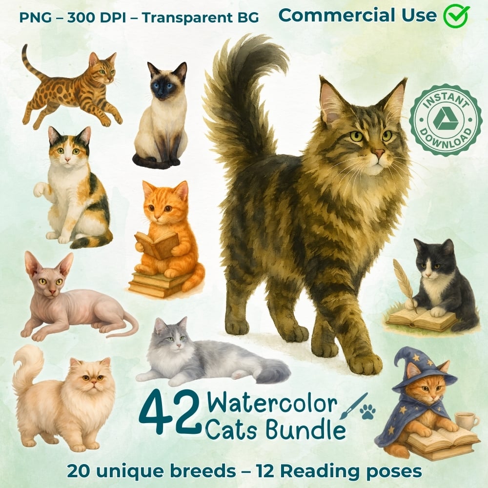 Bring feline magic to every project! This mega bundle combines 42 exclusive watercolor cat illustrations and three matching bookmarks. You’ll receive 30 PNG images of 20 different breeds—from Maine Coon and Siamese to Bengal and Sphynx—each lovingly painted in soft watercolor. It also includes 12 reading‑themed cats enjoying books and tea. All files are delivered as high‑resolution PNGs (300 DPI, ~2000 × 2000 px) with transparent backgrounds, ready for Canva, Photoshop, Procreate or any program that supports PNG files.