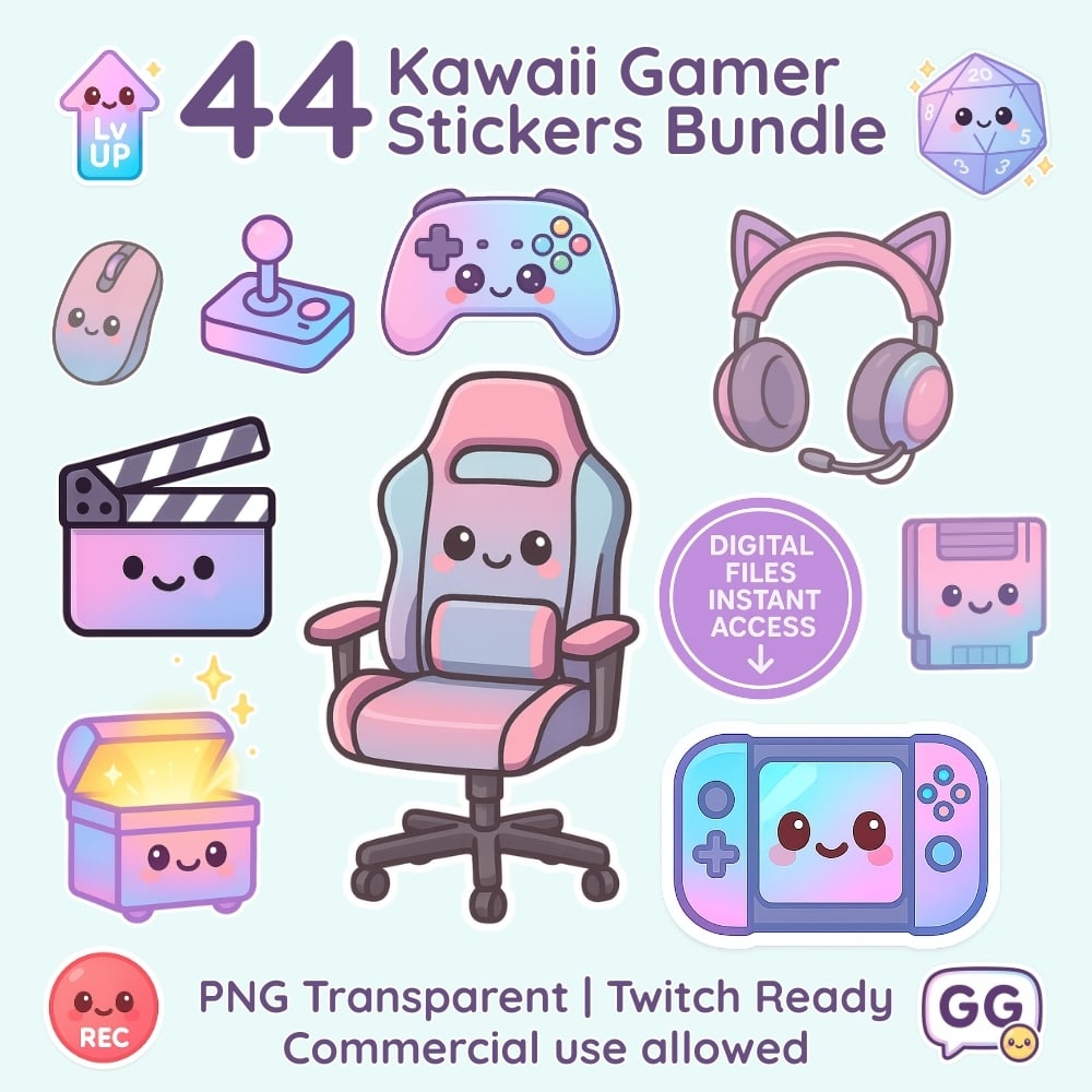 44 unique kawaii-style gamer stickers (PNG, 1024x1024px, 300 DPI).